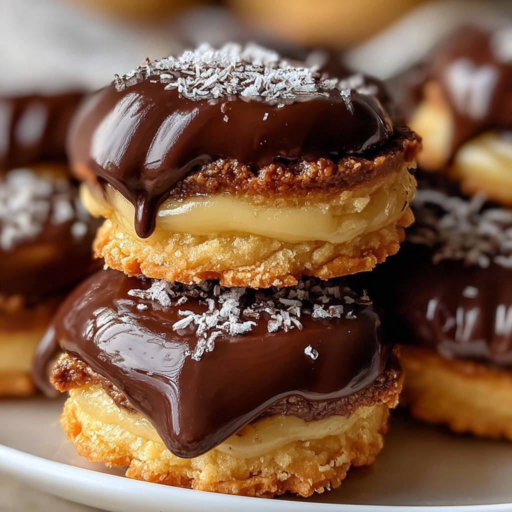 Delightful mini dessert bites inspired by the classic Boston cream pie, featuring velvety pastry cream sandwiched between two soft cookie layers, creating a harmonious blend of flavors for a sweet and creamy treat.
