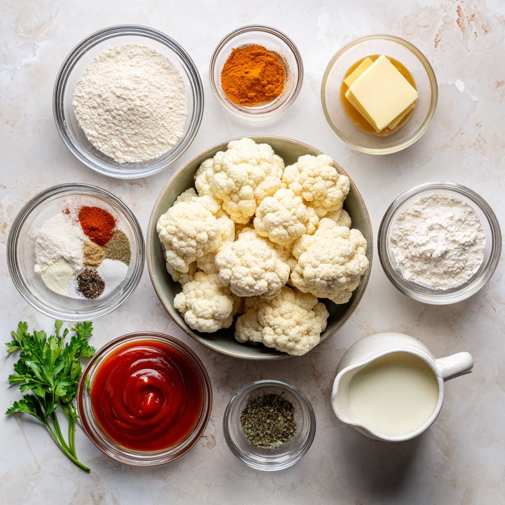 Main ingredients: Cauliflower florets, batter (flour and liquid), frying oil, Buffalo sauce (hot sauce + butter), optional ranch or blue cheese for dipping.