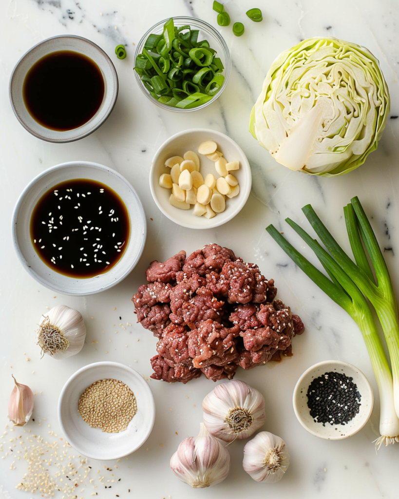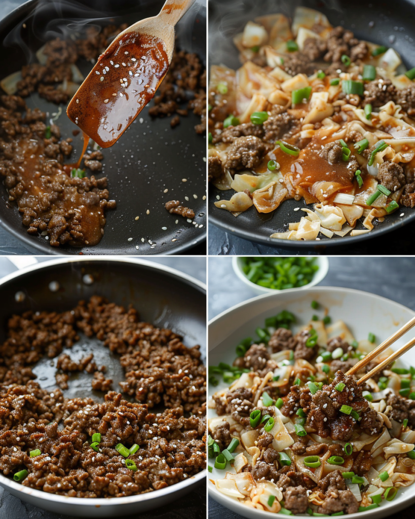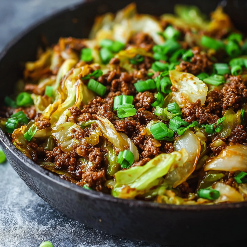 Several versions of this dish use the same core combination of ground beef, cabbage, garlic, ginger, soy sauce or coconut aminos, sesame oil, and a low-carb sweetener. Some also include onions, peppers, chili garlic sauce, or green onions for extra depth and color.