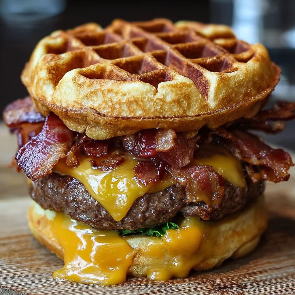This burger is best eaten fresh, because crisp waffles and hot bacon are a big part of the experience. The source recipes emphasize immediate serving after assembly.
